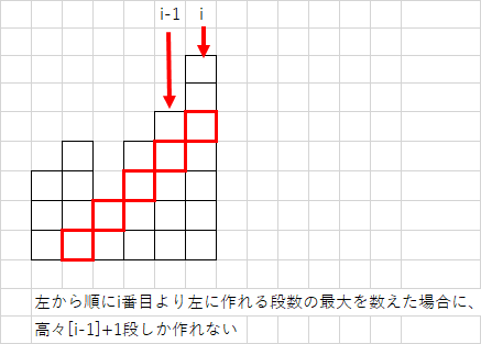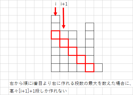 * i番目から左に作れる段数の最大は高々[i-1]+1段。