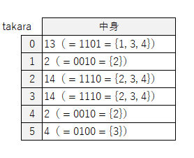 takara[m] |= 1 << c;// シフトしてor演算